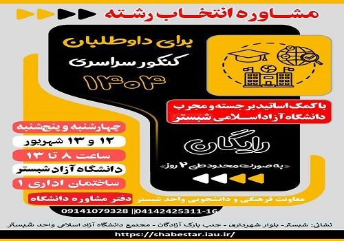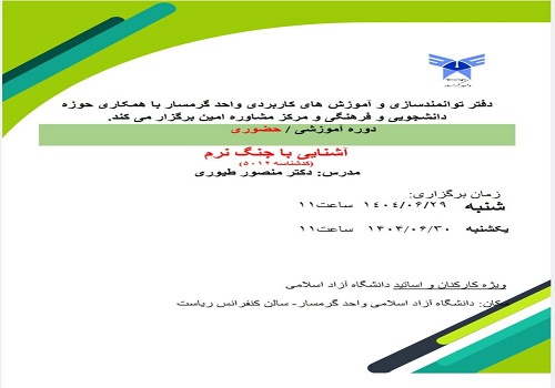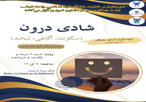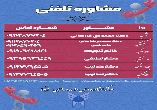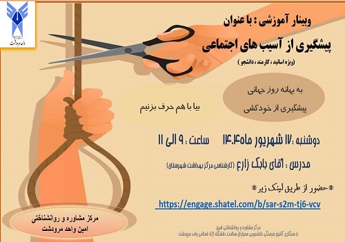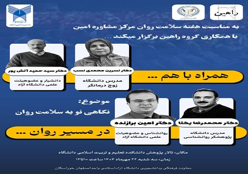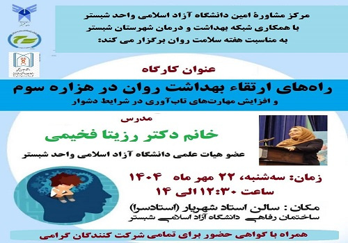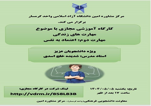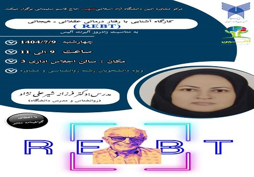 کارگاه آموزشی مجازی خودمراقبتی در شرایط بحرانی ویژه مدیران و مشاوران مراکز مشاوره امین مدرس: دکتر فرشید خسروپور هیات علمی دانشگاه آزاد اسلامی واحد زرند تاریخ: دوشنبه ۱۴ مهر ماه ۱۴۰۴ ساعت ۹ الی ۱۱ لینک حضور : https://vadaroom.ec.iau.ir/v۲/auth/login/v/۷۷۷k۶۴j